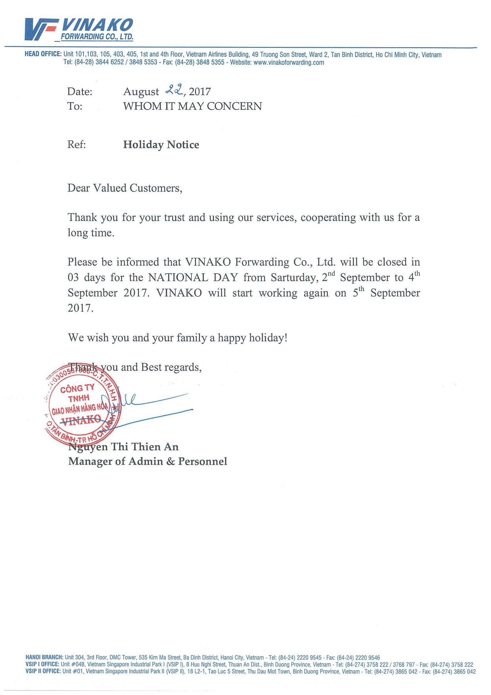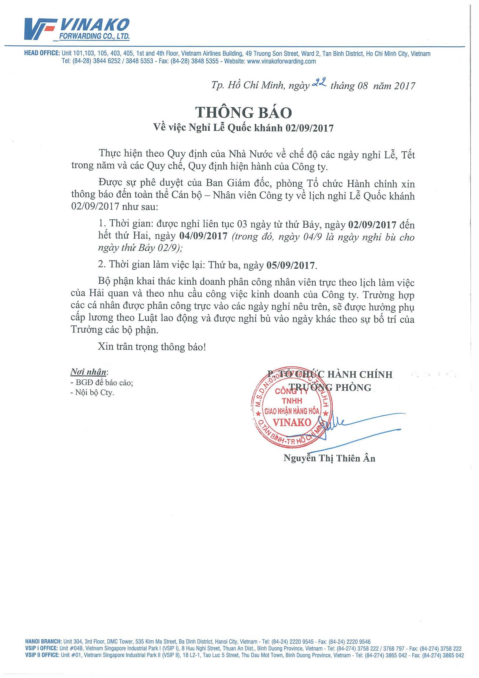 Thông báo nghỉ Lễ Quốc khánh 02/09/2017